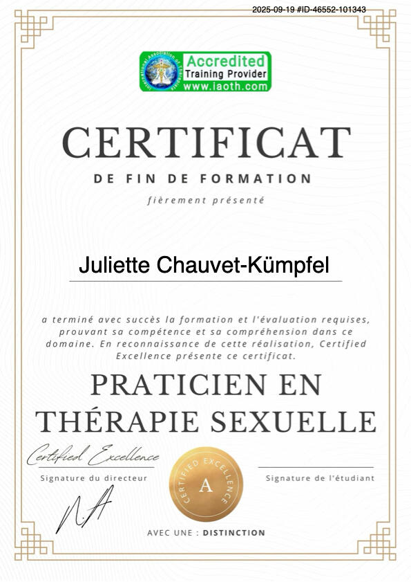 MENTIONS LÉGALESDénomination Le Cabinet InternationalForme juridique Entreprise IndividuelleNom de l’exploitante Juliette Chauvet-KümpfelSIRET 988 367 371 00014Code APE 8690F – Activités de santé humaine non classées ailleurs - Accompagnement thérapeutique des individus ou des couples sur les questions liées à la sexualité, incluant le soutien psychologique et le développement d'une vie sexuelle épanouie.Adresse du siège social 60 rue François 1er, 75008 Paris, FranceContact [email protected]Hébergement du site Carrd Inc. // Adresse : 548 Market St PMB 85210, San Francisco, CA 94104, États-UnisResponsabilité Les informations fournies sur ce site sont données à titre indicatif. Elles ne sauraient remplacer une consultation personnalisée. Juliette Chauvet-Kümpfel décline toute responsabilité en cas d’erreur ou d’omission.Propriété intellectuelle Tous les contenus présents sur ce site (textes, images, logos, vidéos) sont protégés par le droit d’auteur. Toute reproduction ou représentation, même partielle, sans autorisation écrite, est interdite.