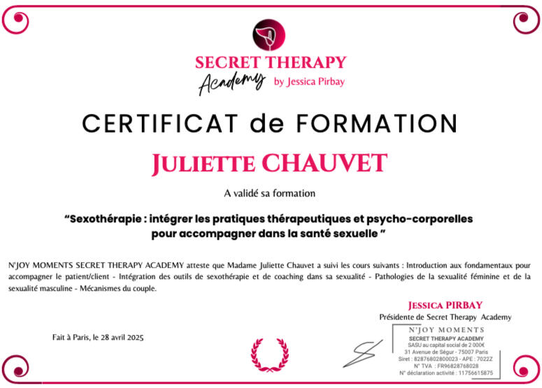 Tout comportement inapproprié, sexuellement explicite, agressif ou déplacé entraînera l’interruption immédiate de la séance, sans remboursement.Juliette Chauvet se réserve le droit de refuser ou mettre fin à toute collaboration en cas de non-respect du cadre ou des valeurs de l’accompagnement.Article 6 – Responsabilités